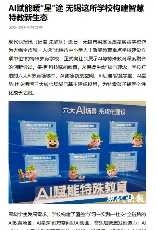 2025年5月,学校正式更名“无锡市梁溪区溪星实验学校”。“溪”承江南文脉,温润包容;“星”喻特殊儿童,各有光芒。更名是坚守初心的宣言,标志着学校在“全生涯赋能、专业化发展、多元化育人”道路上,将以更坚定的信念守护生命成长。同年,学校凭借“AI+特教”创新实践入选无锡市人工智能教育重点学校建设立项单位,教师团队获评市级“四有”好教师重点培育团队,区域入选国家基础教育综合改革特殊教育保障机制试点单位,彰显跨越式发展成效。