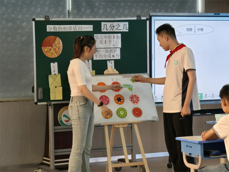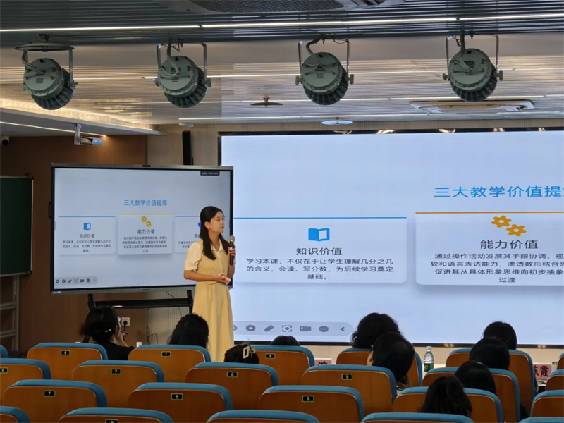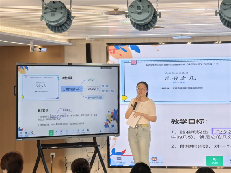 活动以精彩的课堂教学展示拉开帷幕。江阴特校的薛春玉老师与溪星实验学校的费怡韵老师,围绕《生活数学》九年级上册《1. 分数的初步认识—— 几分之几》(第 1 课时)这一课题进行了同课异构的课堂教学,带来了风格各异却同样精彩的教学展示。两位老师充分结合特殊学生的认知特点与学习需求,紧扣新课标要求,巧妙设计教学环节:薛春玉老师注重引导学生通过中秋节生活实例感知分数概念,用直观教具帮助学生突破学习难点;费怡韵老师则以互动游戏操作为载体,激发学生学习兴趣,让学生在动手操作中理解 “几分之几” 的数学含义。两堂课充分展现了教师对 “新教学” 的探索与实践,为在场教师提供了鲜活的教学范例。