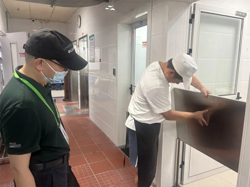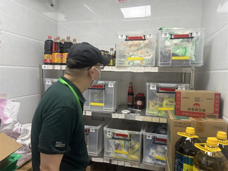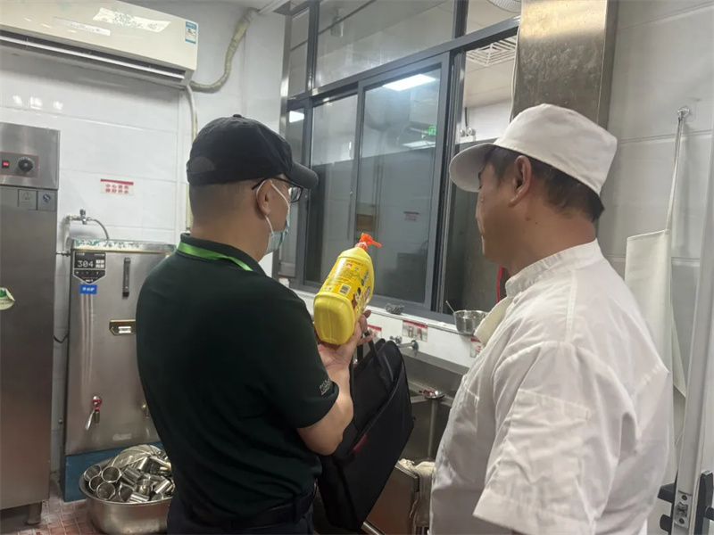随后,姚斌督学深入校园食堂,对食品安全管理工作进行细致检查。他走进食材储藏间、操作间、留样室等区域,查看食材采购验收记录、索证索票是否齐全,检查食品储存环境是否符合规范,仔细核对食品留样的品种、数量、时间及记录情况。此外,还关注食堂工作人员着装规范、场所清洁消毒记录等细节,了解“膳管会”运行及校领导、家长陪餐制度落实情况,要求食堂严格把控食品安全各环节,确保师生用餐安全。